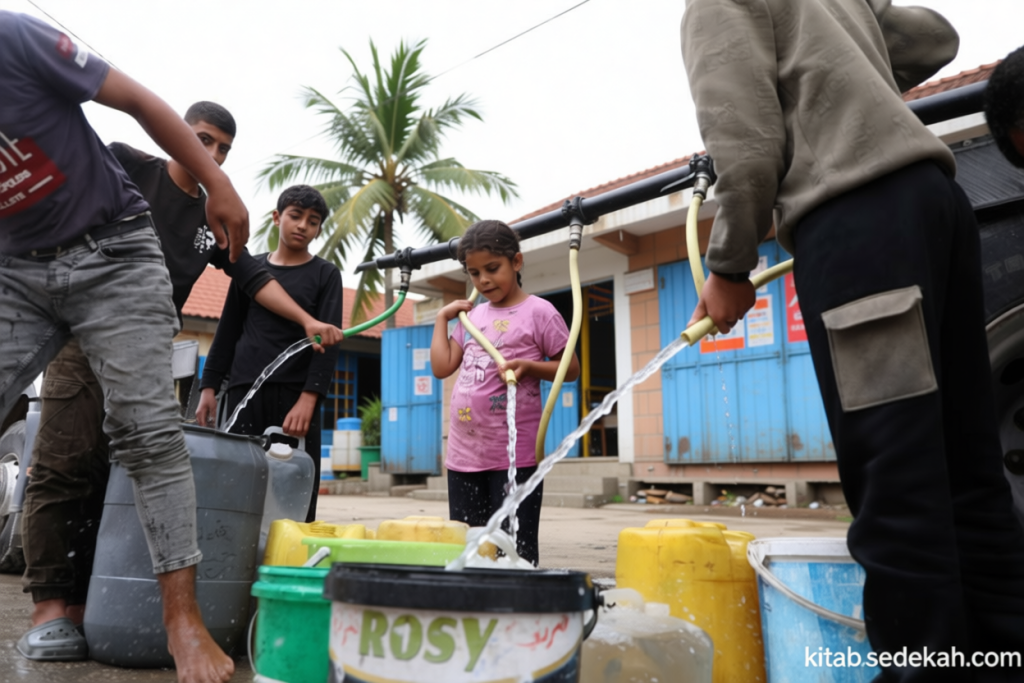 Krisis air bersih melanda Gaza – Pada Senin (27/4), kota Gaza City yang berada di Jalur Gaza tampak dipenuhi oleh warga Palestina yang berdesak-desakan mengambil air dari truk tangki. Anak-anak, ibu-ibu, dan lansia terlihat berusaha mengisi botol mereka dengan air yang dibawa oleh truk, yang menjadi satu-satunya sumber pasokan air minum bagi ratusan keluarga. Keadaan ini mencerminkan krisis air bersih yang berlangsung parah, dengan pasokan yang sangat terbatas. Menurut data dari UNICEF, rata-rata pasokan air minum harian di seluruh wilayah Jalur Gaza hanya sekitar 7 liter per orang. Namun, banyak warga bahkan tidak mampu memenuhi kebutuhan minimum 6 liter per hari, yang diperlukan untuk aktivitas sehari-hari seperti minum, mandi, dan memasak.